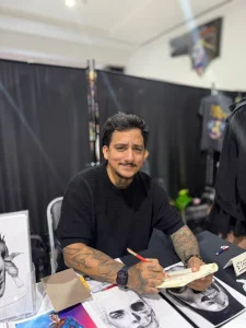 Born in 1987 in Tuxtla Gutiérrez (Mexico), he is a visual artist and illustrator who works with drawing as a critical, narrative, and cultural tool. His production ranges from caricature to muralism, with works that combine humor, technique, and symbolism. With a sharp eye on tradition and identity, he has created pieces that have gone viral — such as his muscular reinterpretation of the Parachico — blending folklore with contemporary aesthetics.